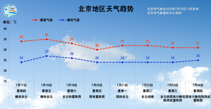 7月17日至24日白天最高气温30~35℃,夜间最低气温24~27℃。